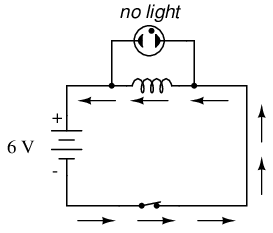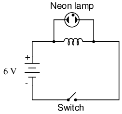 In this circuit, a lamp is connected across the terminals of an inductor. A switch is used to control current in the circuit, and power is supplied by a 6 volt battery. When the switch is closed, the inductor will briefly oppose the change in current from zero to some magnitude, but will drop only a small amount of voltage. It takes about 70 volts to ionize the neon gas inside a neon bulb like this, so the bulb cannot be lit on the 6 volts produced by the battery, or the low voltage momentarily dropped by the inductor when the switch is closed: