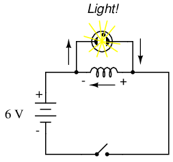 When the switch is opened, however, it suddenly introduces an extremely high resistance into the circuit (the resistance of the air gap between the contacts). This sudden introduction of high resistance into the circuit causes the circuit current to decrease almost instantly. Mathematically, the di/dt term will be a very large negative number. Such a rapid change of current (from some magnitude to zero in very little time) will induce a very high voltage across the inductor, oriented with negative on the left and positive on the right, in an effort to oppose this decrease in current. The voltage produced is usually more than enough to light the neon lamp, if only for a brief moment until the current decays to zero: