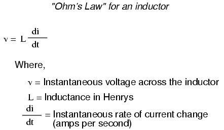 You should recognize the form of this equation from the capacitor chapter. It relates one variable (in this case, inductor voltage drop) to a rate of change of another variable (in this case, inductor current). Both voltage (v) and rate of current change (di/dt) are instantaneous: that is, in relation to a specific point in time, thus the lower-case letters "v" and "i". As with the capacitor formula, it is convention to express instantaneous voltage as v rather than e, but using the latter designation would not be wrong. Current rate-of-change (di/dt) is expressed in units of amps per second, a positive number representing an increase and a negative number representing a decrease.