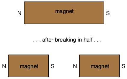 Like electric charges, there were only two types of poles to be found: north and south (by analogy, positive and negative). Just as with electric charges, same poles repel one another, while opposite poles attract. This force, like that caused by static electricity, extended itself invisibly over space, and could even pass through objects such as paper and wood with little effect upon strength.