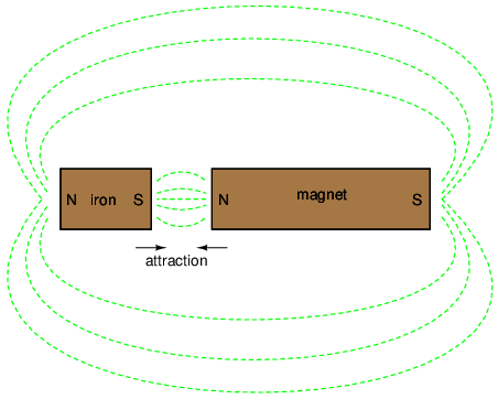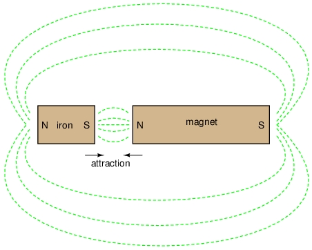 Iron is one of those types of substances that readily magnetizes. If a piece of iron is brought near a permanent magnet, the electrons within the atoms in the iron orient their spins to match the magnetic field force produced by the permanent magnet, and the iron becomes "magnetized." The iron will magnetize in such a way as to incorporate the magnetic flux lines into its shape, which attracts it toward the permanent magnet, no matter which pole of the permanent magnet is offered to the iron: