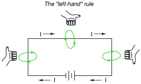 Detailed experiments showed that the magnetic field produced by an electric current is always oriented perpendicular to the direction of flow. A simple method of showing this relationship is called the left-hand rule. Simply stated, the left-hand rule says that the magnetic flux lines produced by a current-carrying wire will be oriented the same direction as the curled fingers of a person's left hand (in the "hitchhiking" position), with the thumb pointing in the direction of electron flow: