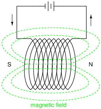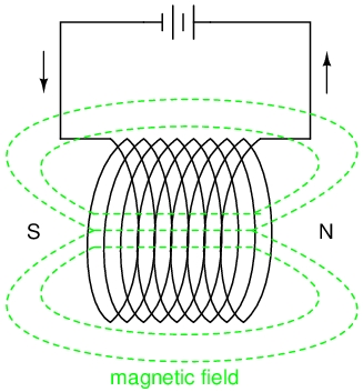 While the magnetic field surrounding a current-carrying wire is indeed interesting, it is quite weak for common amounts of current, able to deflect a compass needle and not much more. To create a stronger magnetic field force (and consequently, more field flux) with the same amount of electric current, we can wrap the wire into a coil shape, where the circling magnetic fields around the wire will join to create a larger field with a definite magnetic (north and south) polarity: