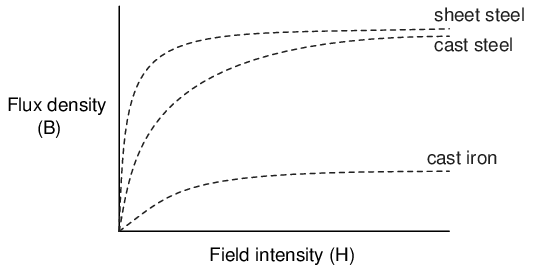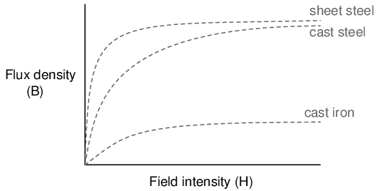 This is called the normal magnetization curve, or B-H curve, for any particular material. Notice how the flux density for any of the above materials (cast iron, cast steel, and sheet steel) levels off with increasing amounts of field intensity. This effect is known as saturation. When there is little applied magnetic force (low H), only a few atoms are in alignment, and the rest are easily aligned with additional force. However, as more flux gets crammed into the same cross-sectional area of a ferromagnetic material, fewer atoms are available within that material to align their electrons with additional force, and so it takes more and more force (H) to get less and less "help" from the material in creating more flux density (B). To put this in economic terms, we're seeing a case of diminishing returns (B) on our investment (H). Saturation is a phenomenon limited to iron-core electromagnets. Air-core electromagnets don't saturate, but on the other hand they don't produce nearly as much magnetic flux as a ferromagnetic core for the same number of wire turns and current.