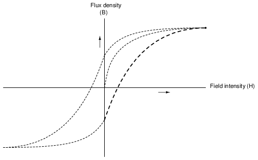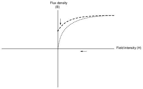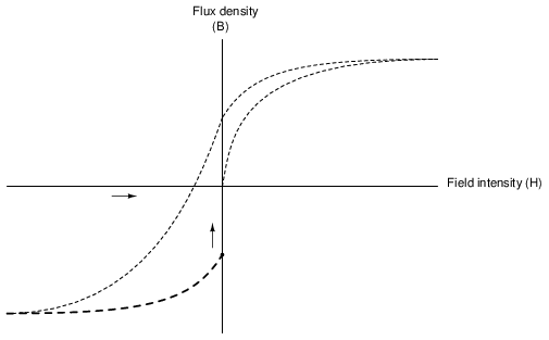 The flux density has now reached a point equivalent to what it was with a full positive value of field intensity (H), except in the negative, or opposite, direction. Let's stop the current going through the coil again and see how much flux remains: