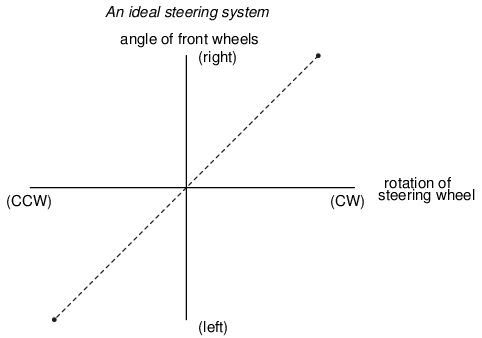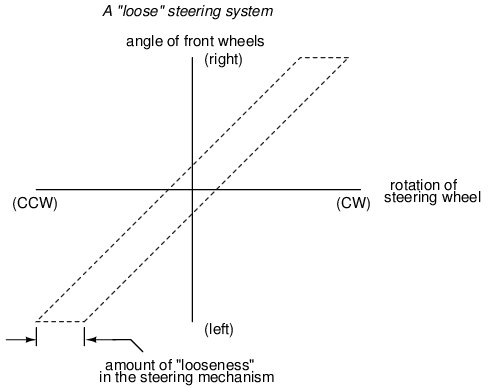 The "S"-shaped curve traced by these steps form what is called the hysteresis curve of a ferromagnetic material for a given set of field intensity extremes (-H and +H). If this doesn't quite make sense, consider a hysteresis graph for the automobile steering scenario described earlier, one graph depicting a "tight" steering system and one depicting a "loose" system:
