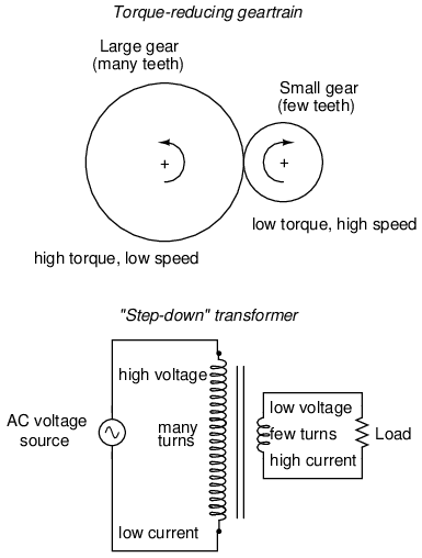 A very useful property of transformers is the ability to transform voltage and current levels according to a simple ratio, determined by the ratio of input and output coil turns. If the energized coil of a transformer is energized by an AC voltage, the amount of AC voltage induced in the unpowered coil will be equal to the input voltage multiplied by the ratio of output to input wire turns in the coils. Conversely, the current through the windings of the output coil compared to the input coil will follow the opposite ratio: if the voltage is increased from input coil to output coil, the current will be decreased by the same proportion. This action of the transformer is analogous to that of mechanical gear, belt sheave, or chain sprocket ratios: