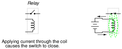 Another example is the relay, an electrically-controlled switch. If a switch contact mechanism is built so that it can be actuated (opened and closed) by the application of a magnetic field, and an electromagnet coil is placed in the near vicinity to produce that requisite field, it will be possible to open and close the switch by the application of a current through the coil. In effect, this gives us a device that enables elelctricity to control electricity: