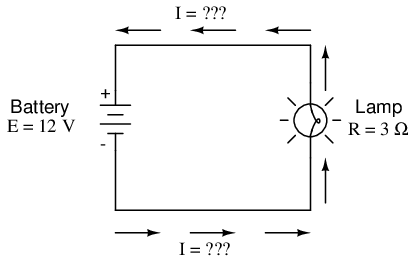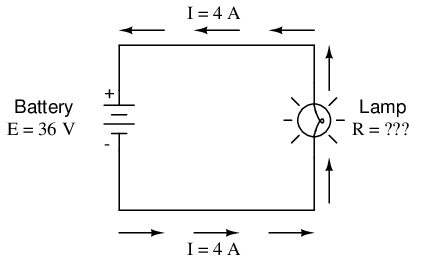 For instance, our previous circuit example with the 3 Ω lamp, we calculated current through the circuit by dividing voltage by resistance (I=E/R). With an 18 volt battery, our circuit current was 6 amps. Doubling the battery voltage to 36 volts resulted in a doubled current of 12 amps. All of this makes sense, of course, so long as the lamp continues to provide exactly the same amount of friction (resistance) to the flow of electrons through it: 3 Ω.