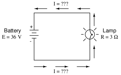 Now, the battery voltage is 36 volts instead of 18 volts. The lamp is still providing 3 Ω of electrical resistance to the flow of electrons. The current is now: