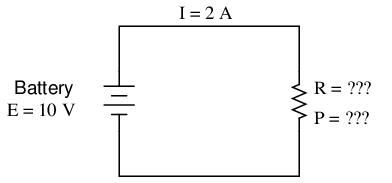 All we've been given here to start with is the battery voltage (10 volts) and the circuit current (2 amps). We don't know the resistor's resistance in ohms or the power dissipated by it in watts. Surveying our array of Ohm's Law equations, we find two equations that give us answers from known quantities of voltage and current: