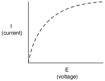 The plot is no longer a straight line. It rises sharply on the left, as voltage increases from zero to a low level. As it progresses to the right we see the line flattening out, the circuit requiring greater and greater increases in voltage to achieve equal increases in current.