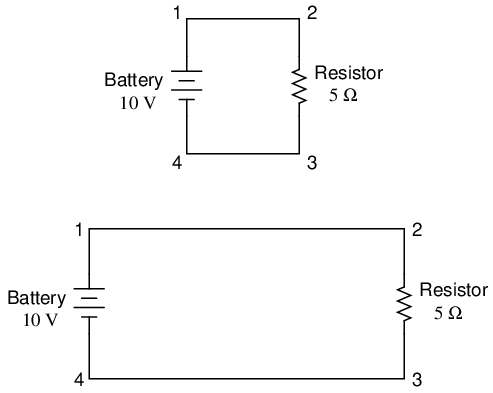 If connecting wire resistance is very little or none, we can regard the connected points in a circuit as being electrically common. That is, points 1 and 2 in the above circuits may be physically joined close together or far apart, and it doesn't matter for any voltage or resistance measurements relative to those points. The same goes for points 3 and 4. It is as if the ends of the resistor were attached directly across the terminals of the battery, so far as our Ohm's Law calculations and voltage measurements are concerned. This is useful to know, because it means you can re-draw a circuit diagram or re-wire a circuit, shortening or lengthening the wires as desired without appreciably impacting the circuit's function. All that matters is that the components attach to each other in the same sequence.