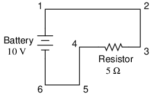 Here, we only have 2 components excluding the wires: the battery and the resistor. Though the connecting wires take a convoluted path in forming a complete circuit, there are several electrically common points in the electrons' path. Points 1, 2, and 3 are all common to each other, because they're directly connected together by wire. The same goes for points 4, 5, and 6.