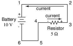 As the current encounters the 5 Ω resistance, voltage is dropped across the resistor's ends. The polarity of this voltage drop is negative (-) at point 4 with respect to positive (+) at point 3. We can mark the polarity of the resistor's voltage drop with these negative and positive symbols, in accordance with the direction of current (whichever end of the resistor the current is entering is negative with respect to the end of the resistor it is exiting: