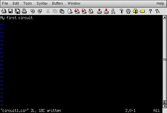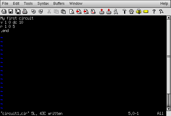 Once we have finished typing all the necessary SPICE commands, we need to "save" them to a file on the computer's hard disk so that SPICE has something to reference to when invoked. Since this is my first SPICE netlist, I'll save it under the filename "circuit1.cir" (the actual name being arbitrary). You may elect to name your first SPICE netlist something completely different, just as long as you don't violate any filename rules for your operating system, such as using no more than 8+3 characters (eight characters in the name, and three characters in the extension: 12345678.123) in DOS.
