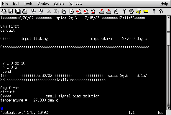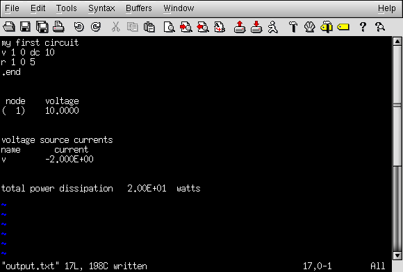 SPICE will run "silently" this time, without the stream of text output to the computer screen as before. A new file, output1.txt, will be created, which you may open and change using a text editor or word processor. For this illustration, I'll use the same text editor (Vim) to open this file: