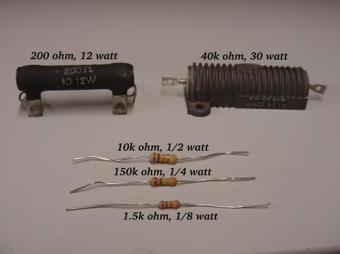 Because resistors dissipate heat energy as the electric currents through them overcome the "friction" of their resistance, resistors are also rated in terms of how much heat energy they can dissipate without overheating and sustaining damage. Naturally, this power rating is specified in the physical unit of "watts." Most resistors found in small electronic devices such as portable radios are rated at 1/4 (0.25) watt or less. The power rating of any resistor is roughly proportional to its physical size. Note in the first resistor photograph how the power ratings relate with size: the bigger the resistor, the higher its power dissipation rating. Also note how resistances (in ohms) have nothing to do with size!