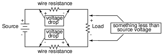 In order to calculate what these voltage drops will be in any particular circuit, we must be able to ascertain the resistance of ordinary wire, knowing the wire size and diameter. Some of the following sections of this chapter will address the details of doing this.