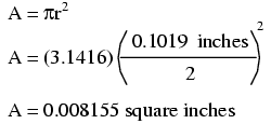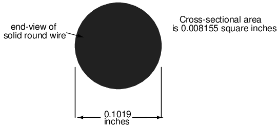 The wire cross-section picture shown above is, of course, not drawn to scale. The diameter is shown as being 0.1019 inches. Calculating the area of the cross-section with the formula Area = πr2, we get an area of 0.008155 square inches: