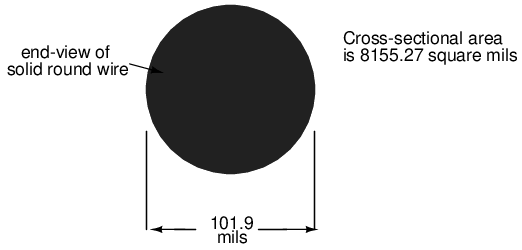 These are fairly small numbers to work with, so wire sizes are often expressed in measures of thousandths-of-an-inch, or mils. For the illustrated example, we would say that the diameter of the wire was 101.9 mils (0.1019 inch times 1000). We could also, if we wanted, express the area of the wire in the unit of square mils, calculating that value with the same circle-area formula, Area = πr2: