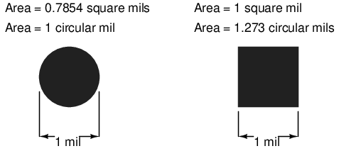 Because this is a unit of area measurement, the mathematical power of 2 is still in effect (doubling the width of a circle will always quadruple its area, no matter what units are used, or if the width of that circle is expressed in terms of radius or diameter). To illustrate the difference between measurements in square mils and measurements in circular mils, I will compare a circle with a square, showing the area of each shape in both unit measures: