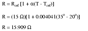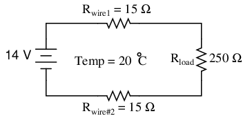 At 20o Celsius, we get 12.5 volts across the load and a total of 1.5 volts (0.75 + 0.75) dropped across the wire resistance. If the temperature were to rise to 35o Celsius, we could easily determine the change of resistance for each piece of wire. Assuming the use of copper wire (α = 0.004041) we get: