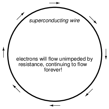 Rings of superconducting material have been experimentally proven to sustain continuous current for years with no applied voltage. So far as anyone knows, there is no theoretical time limit to how long an unaided current could be sustained in a superconducting circuit. If you're thinking this appears to be a form of perpetual motion, you're correct! Contrary to popular belief, there is no law of physics prohibiting perpetual motion; rather, the prohibition stands against any machine or system generating more energy than it consumes (what would be referred to as an over-unity device). At best, all a perpetual motion machine (like the superconducting ring) would be good for is to store energy, not generate it freely!