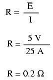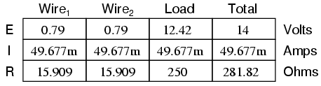 This circuit has a total wire resistance (wire 1 + wire 2) of 30 Ω at standard temperature. Setting up a table of voltage, current, and resistance values we get: