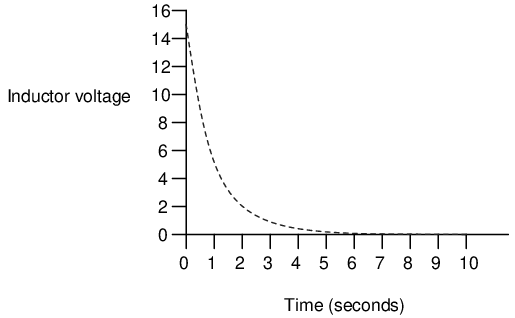 Just as with the RC circuit, the inductor voltage's approach to 0 volts and the current's approach to 15 amps over time is asymptotic. For all practical purposes, though, we can say that the inductor voltage will eventually reach 0 volts and that the current will eventually equal the maximum of 15 amps.