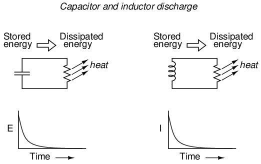 Let's consider what happens to each of these reactive components in a condition of discharge: that is, when energy is being released from the capacitor or inductor to be dissipated in the form of heat by a resistor: