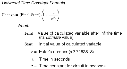 Indeed, we end up with a value of 2 seconds for the time it takes to go from 0 to 12.970 volts across the capacitor. This variation of the universal time constant formula will work for all capacitive and inductive circuits, both "charging" and "discharging," provided the proper values of time constant, Start, Final, and Change are properly determined beforehand. Remember, the most important step in solving these problems is the initial set-up. After that, its just a lot of button-pushing on your calculator!
