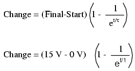 If the capacitor starts in a totally discharged state (0 volts), then we can use that value of voltage for a "starting" value. The final value, of course, will be the battery voltage (15 volts). Our universal formula for capacitor voltage in this circuit looks like this:
