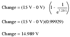 Since we started at a capacitor voltage of 0 volts, this increase of 14.989 volts means that we have 14.989 volts after 7.25 seconds.