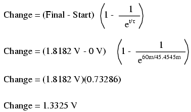 Again, because our starting value for capacitor voltage was assumed to be zero, the actual voltage across the capacitor at 60 milliseconds is equal to the amount of voltage change from zero, or 1.3325 volts.