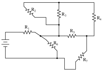 Typically, complex circuits are not arranged in nice, neat, clean schematic diagrams for us to follow. They are often drawn in such a way that makes it difficult to follow which components are in series and which are in parallel with each other. The purpose of this section is to show you a method useful for re-drawing circuit schematics in a neat and orderly fashion. Like the stage-reduction strategy for solving series-parallel combination circuits, it is a method easier demonstrated than described.