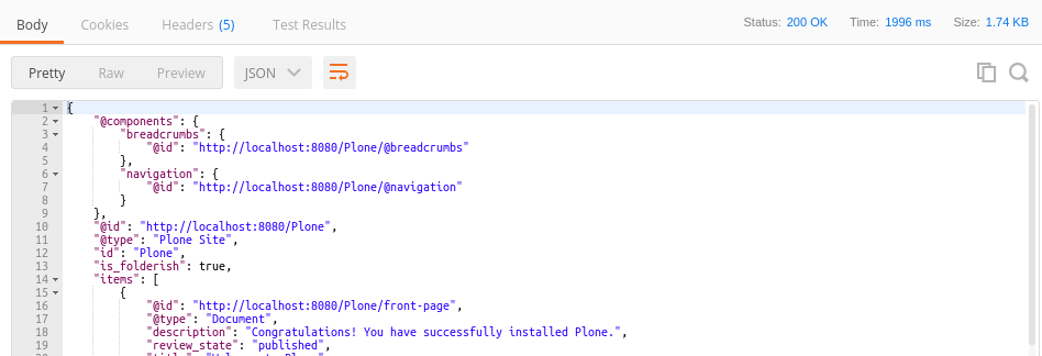 The Response of the server is now displayed below the Request. You can easily follow the links on the @id attributes by clicking on them. For every link Postman has prepared another request sharing the same headers that can be send again by licking on the Send button.