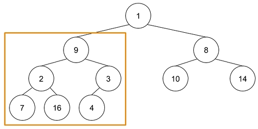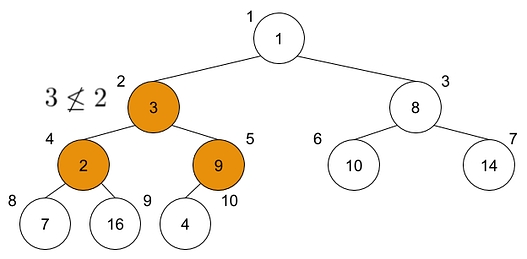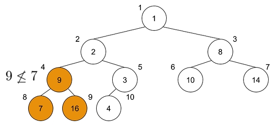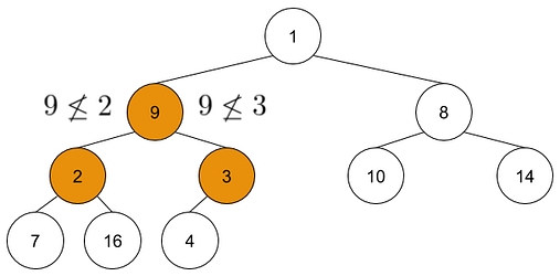 Look at the nodes surrounded by the orange square. We find that 9 is larger than both of 2 and 3, so these three nodes don’t satisfy the heap property (The value of node should be less than or equal to the values of its child nodes). Please check the orange nodes below.