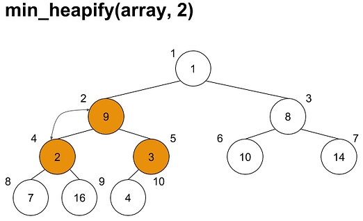 Let’s check the way how min_heapify works by producing a heap from the tree structure above. First, we call min_heapify(array, 2) to exchange the node of index 2 with the node of index 4.