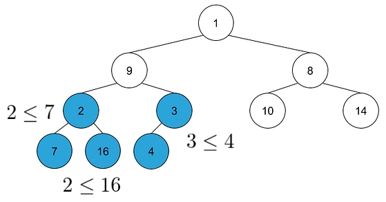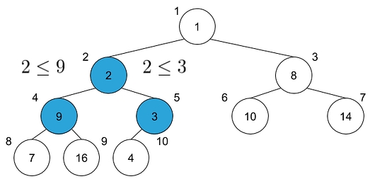 If the subtree exchanged the node of index 2 with the node of index5, the subtree won’t meet the heap property like below. So the subtree exchange the node has the smallest value in the subtree with the parent node to satisfy the heap property.