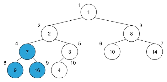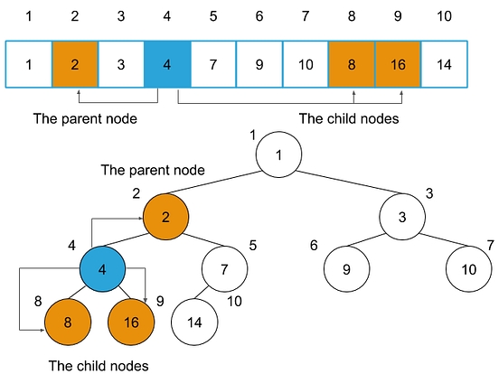 The parent node corresponds to the item of index 2 by parent(i) = 4 / 2 = 2. The child nodes correspond to the items of index 8 and 9 by left(i) = 2 * 2 = 4, right(i) = 2 * 2 + 1 = 5, respectively.