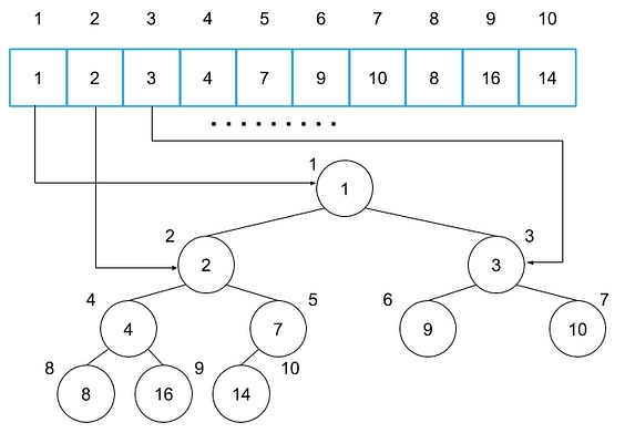 A heap is one of the tree structures and represented as a binary tree. I put the image of heap below. You can implement a tree structure by a pointer or an array. In this post, I choose to use the array implementation like below. In terms of space complexity, the array implementation has more benefits than the pointer implementation. The indices of the array correspond to the node number in the below image.