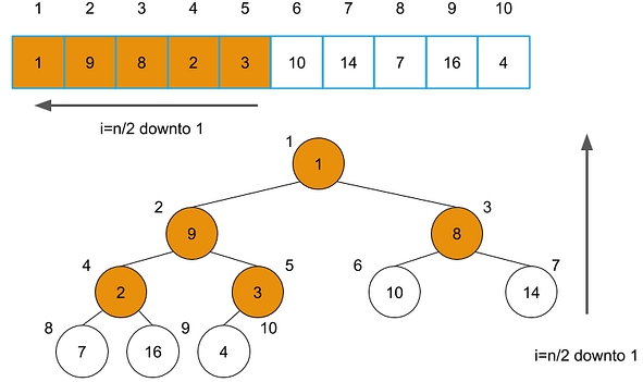 This function iterates the nodes except the leaf nodes with the for-loop and applies min_heapify to each node. We don’t need to apply min_heapify to the items of indices after n/2+1, which are all the leaf nodes. We apply min_heapify in the orange nodes below.