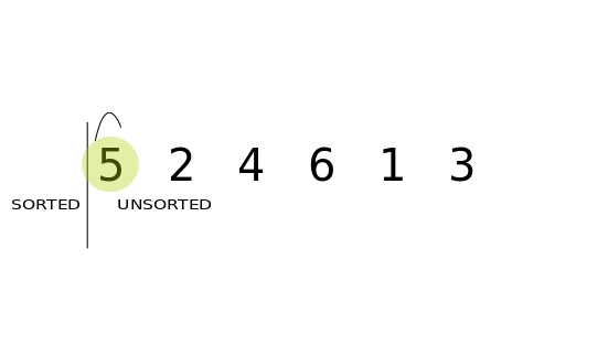 2, 8, 5, 2, 6 - ordered, so leave them alone 2, 8, 5, 2, 6 - not ordered, so swap 2, 5, 8, 2, 6 - not ordered, so swap 2, 5, 2, 8, 6 - not ordered, so swap 2, 5, 2, 6, 8 - the first pass is complete Because at least one swap occurred, the algorithm knows that it wasn't sorted. It needs to make another pass. It starts over again at the first entry and goes to the next-to-last entry doing the comparisons, again. It only needs to go to the next-to-last entry because the previous "bubbling" put the largest entry in the last position.