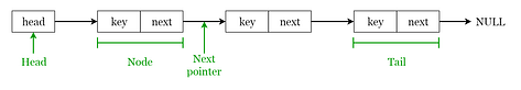 Each node contains a key and a pointer to its successor node, known as next.