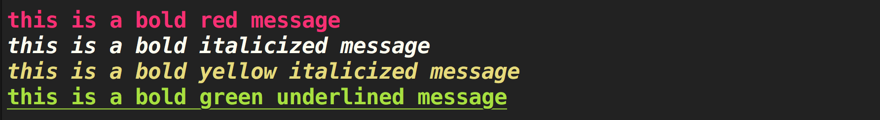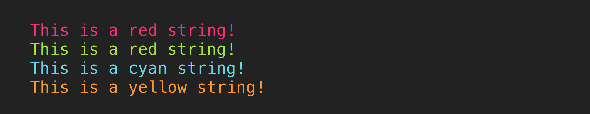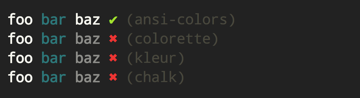 String.prototypelike colors.Supports nested colors, and does not have the nested styling bug that is present in colorette, chalk, and kleur.