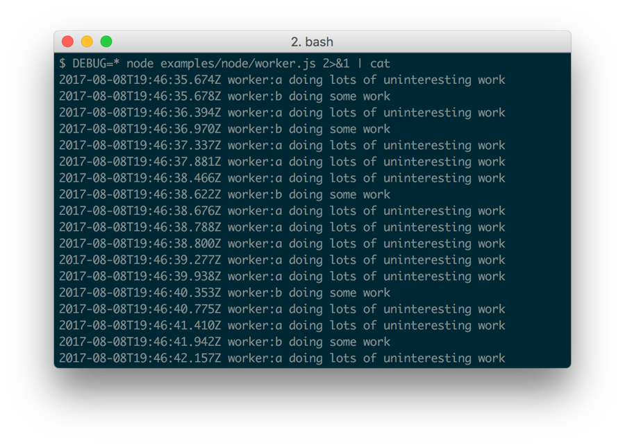 Debug's enable state is currently persisted by localStorage. Consider the situation shown below where you have worker:a and worker:b, and wish to debug both. You can enable this using localStorage.debug: