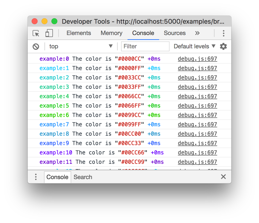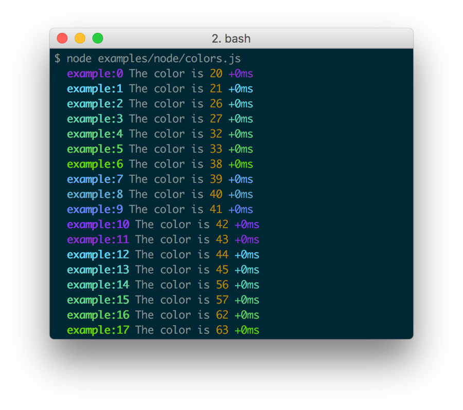 Every debug instance has a color generated for it based on its namespace name. This helps when visually parsing the debug output to identify which debug instance a debug line belongs to.