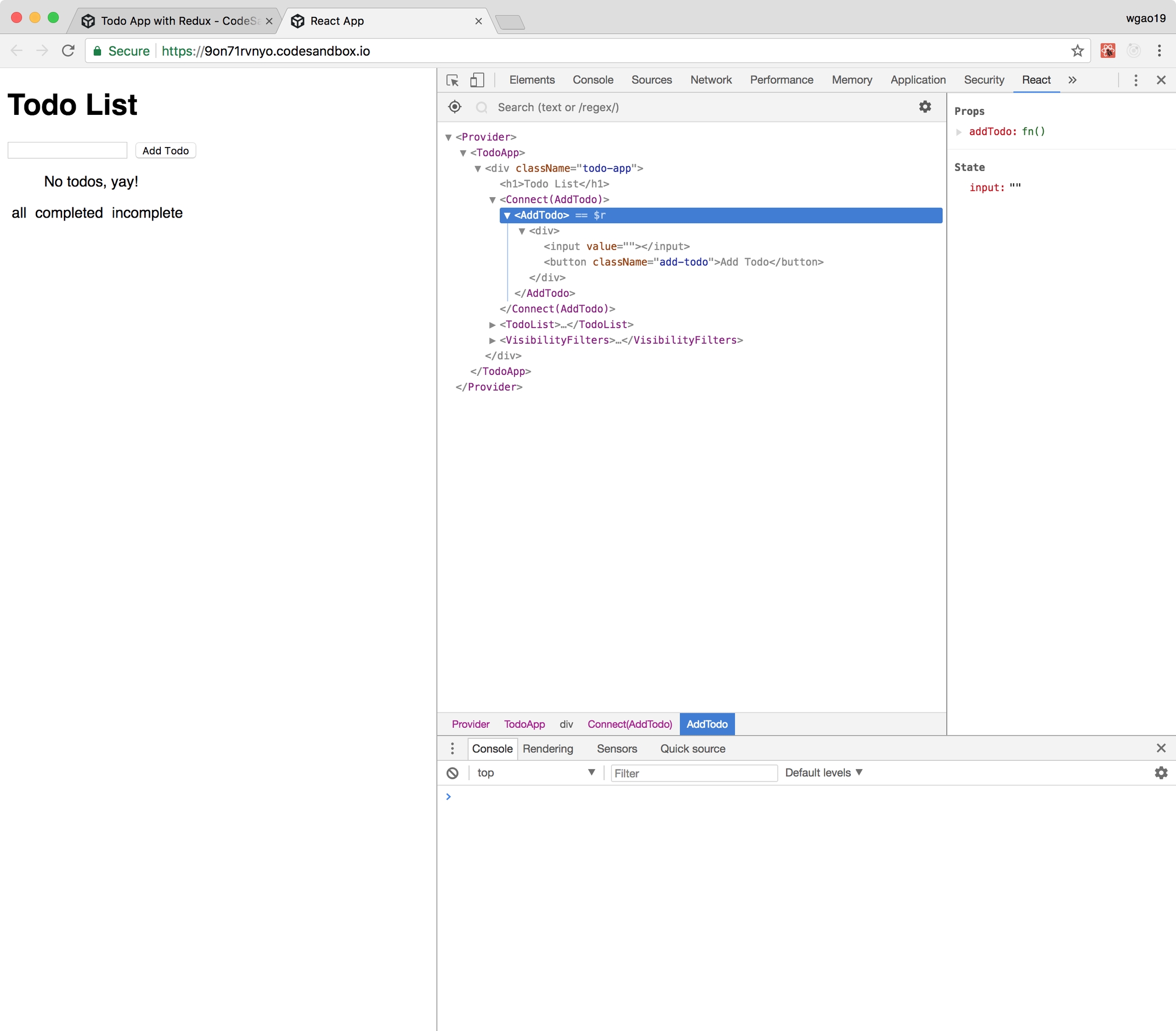 is the component that allows a user to input a todo item and add to the list upon clicking its “Add Todo” button:It uses a controlled input that sets state upon