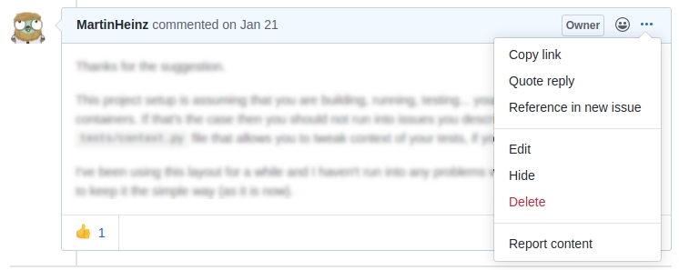 To be able to create response, we will need the comment ID. It can be retrieved from API shown here in docs or by clicking on the three dots icon in upper right corner of issue comment and clicking Copy Link: